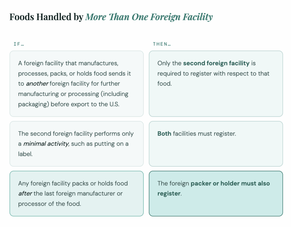 This applies to domestic and foreign facilities alike. If the facility packs or holds food after the last foreign manufacturer or processor, the foreign packer or holder must also register. In multi-facility chains, more than one site may need registration.